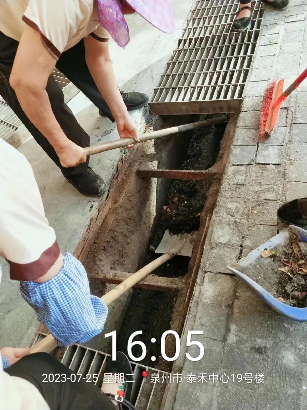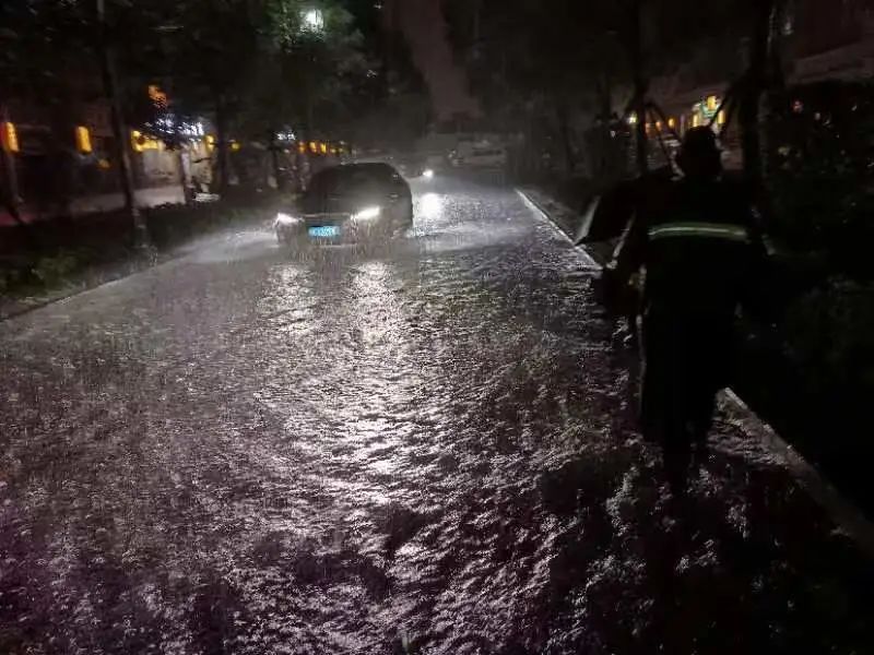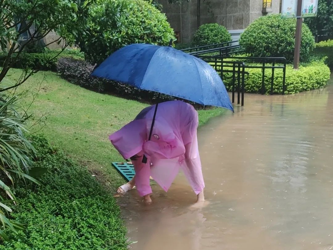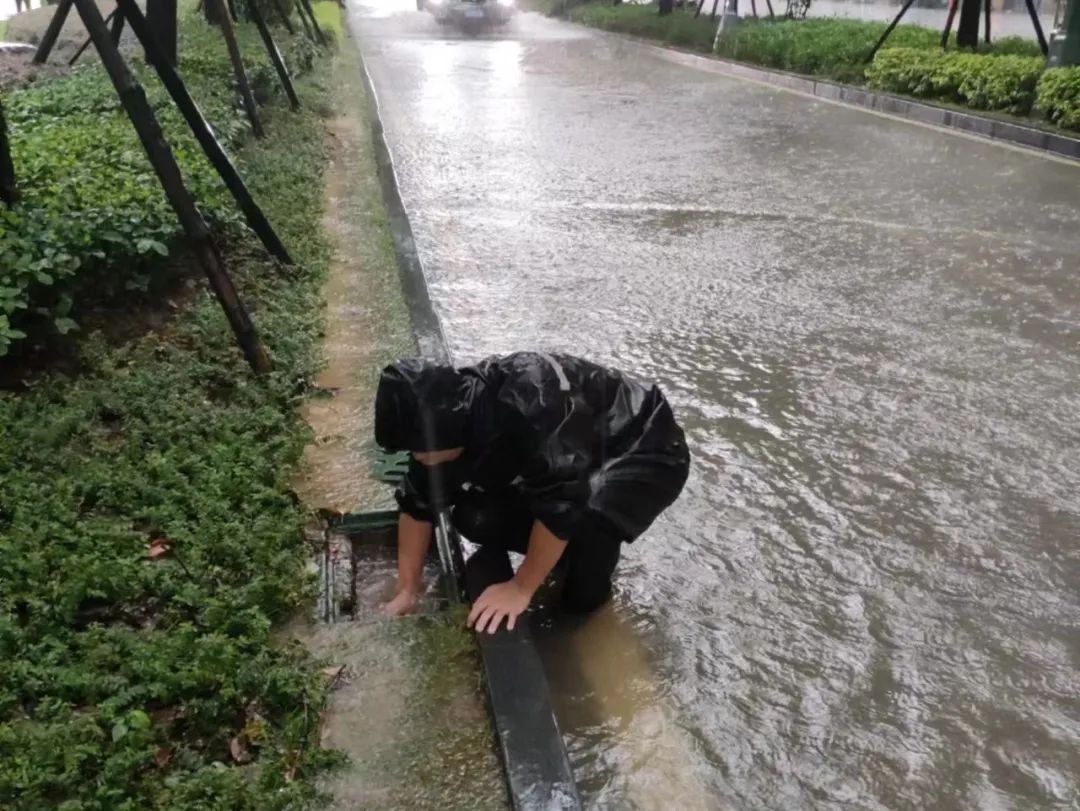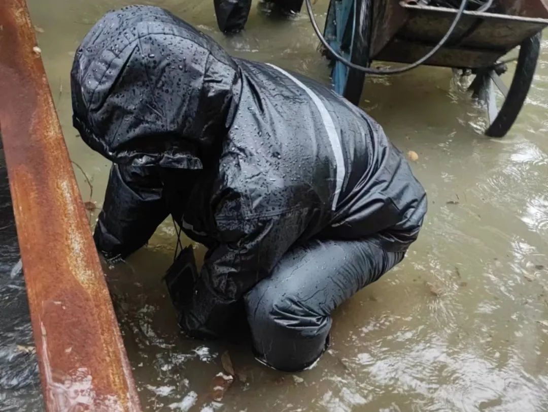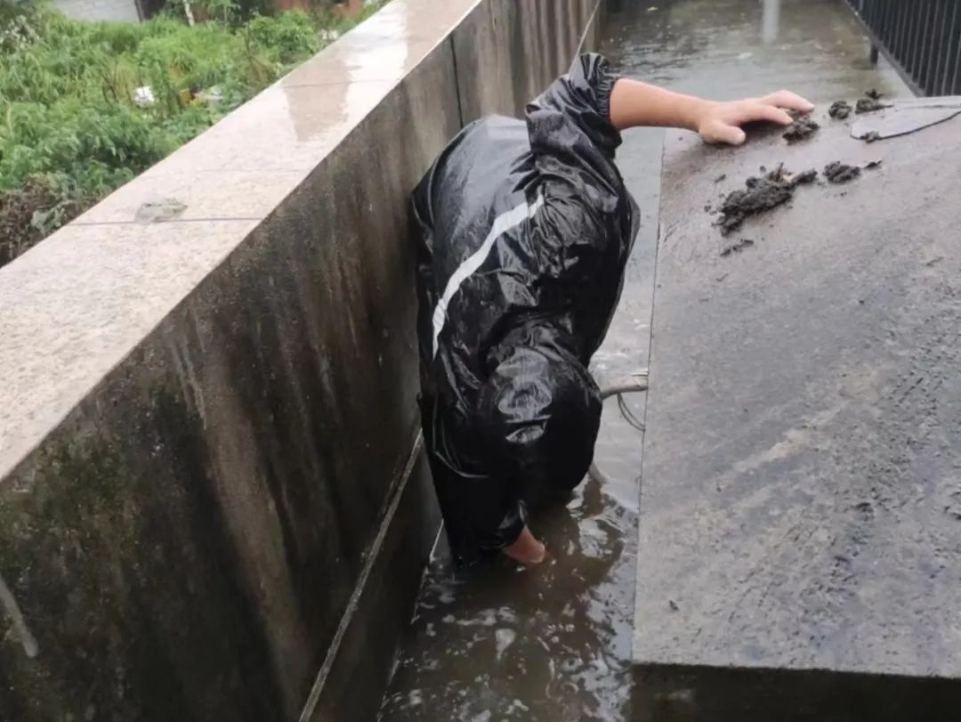 他们在雨中反复趴下、清污、奔跑,为疏通道路积水;
