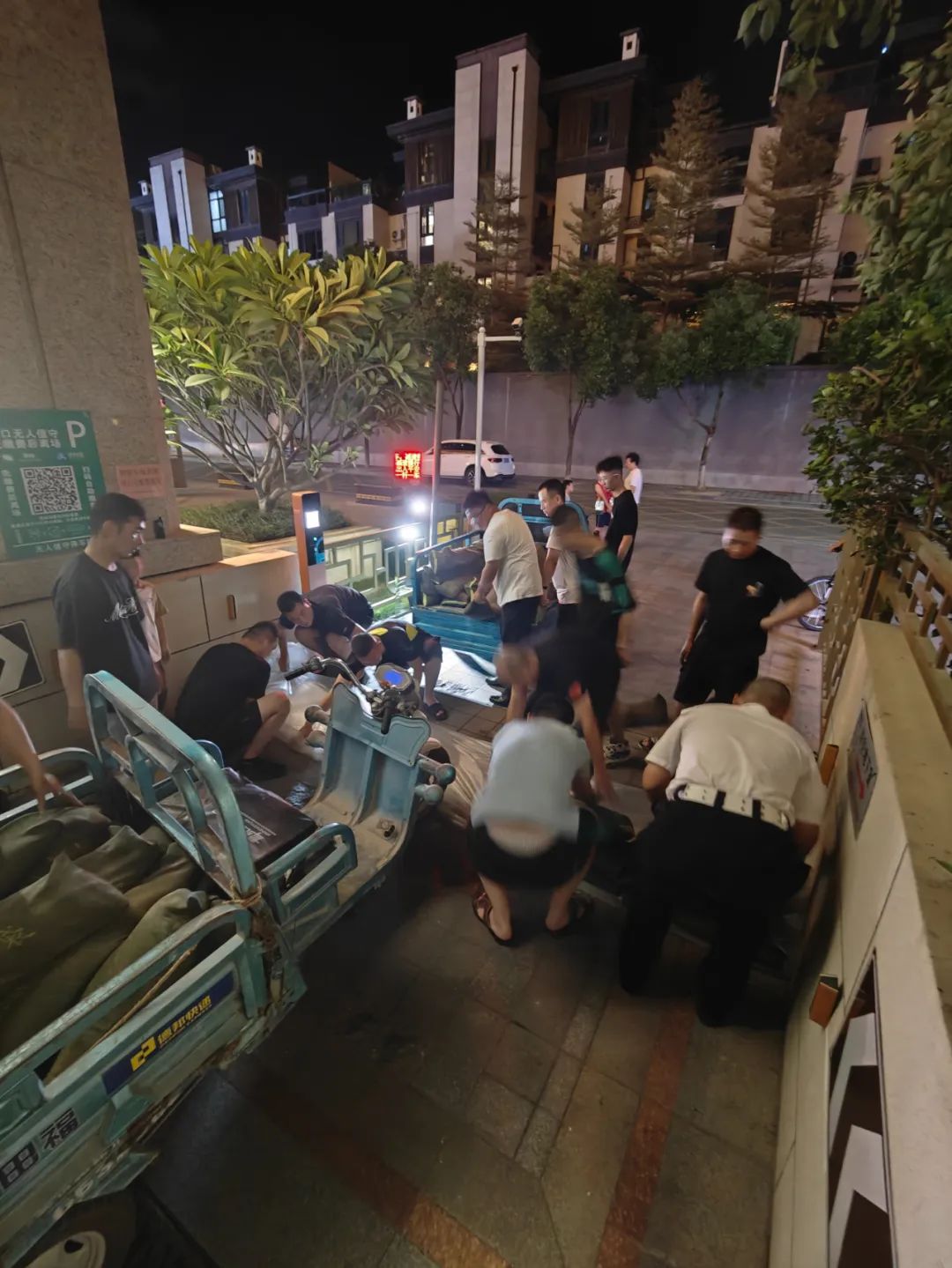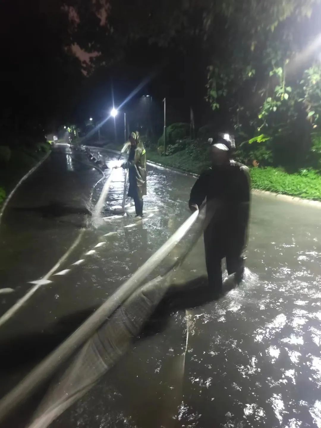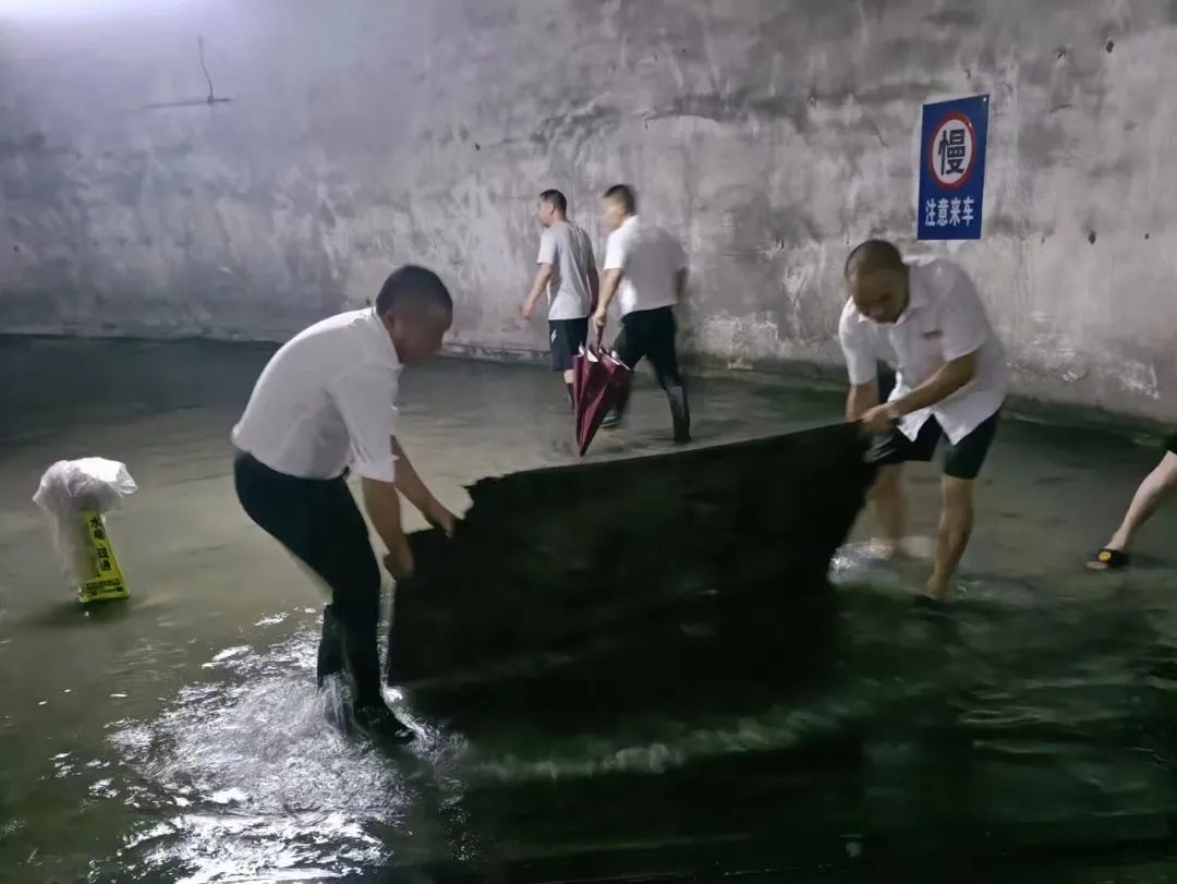 他们清理积水,昼夜奋战,为保园区安全。