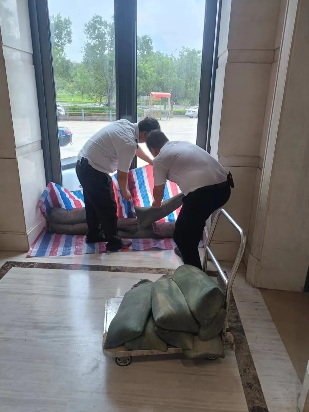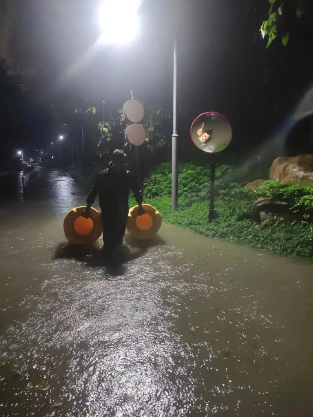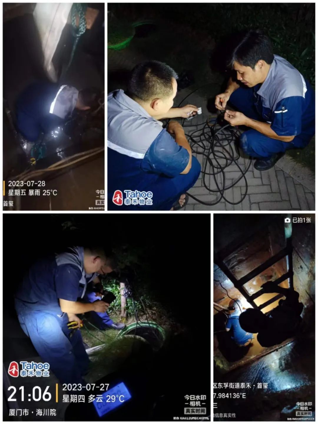 他们清理积水,昼夜奋战,为保园区安全。