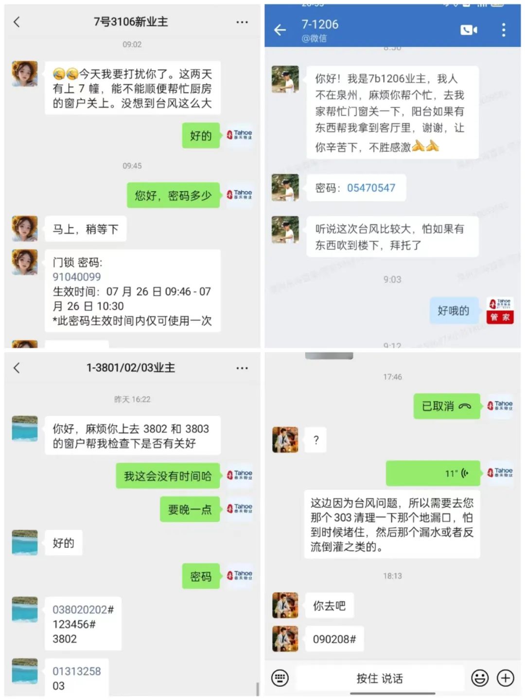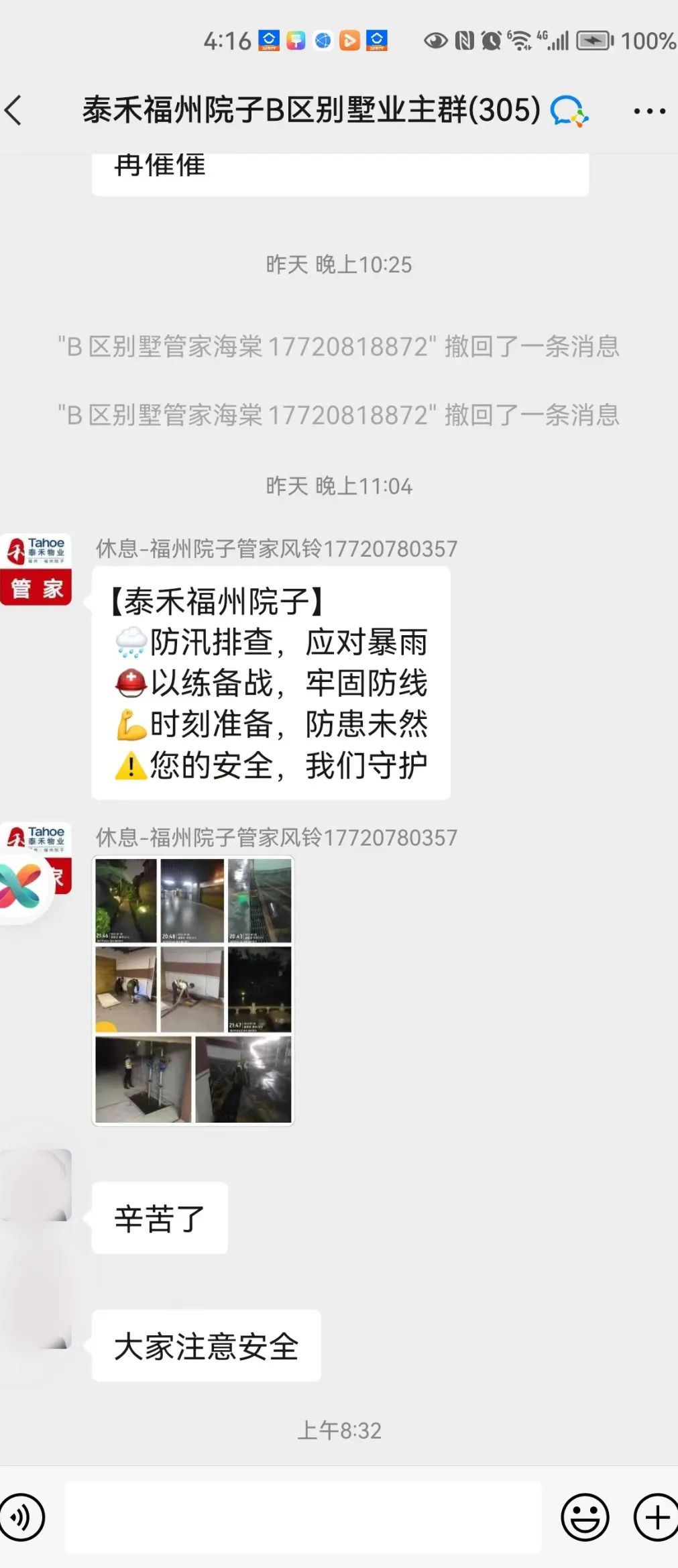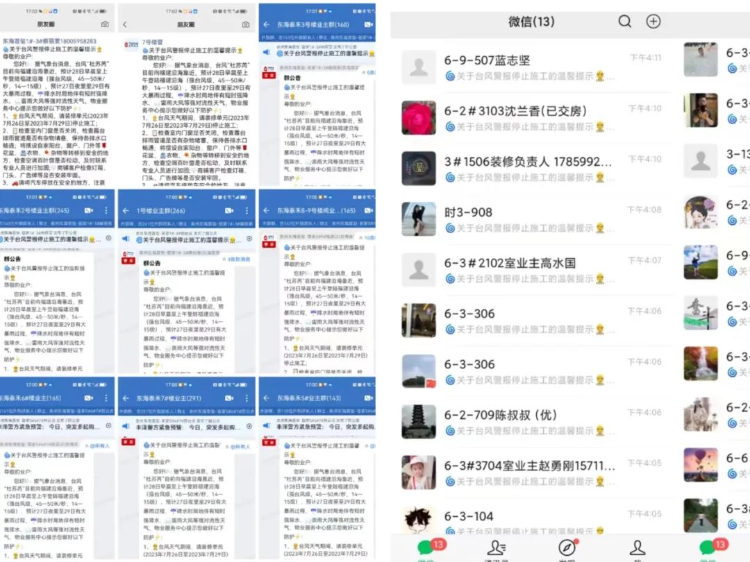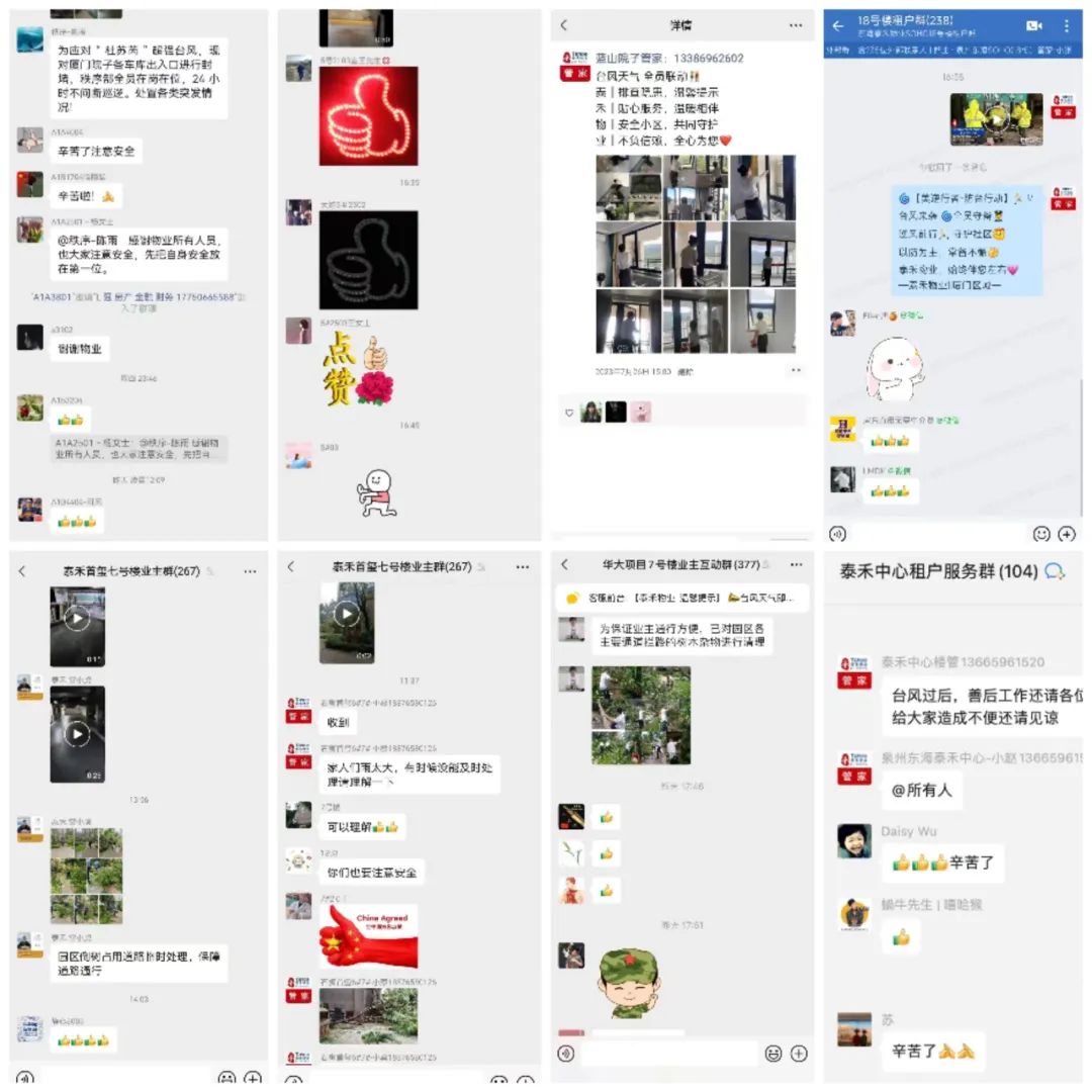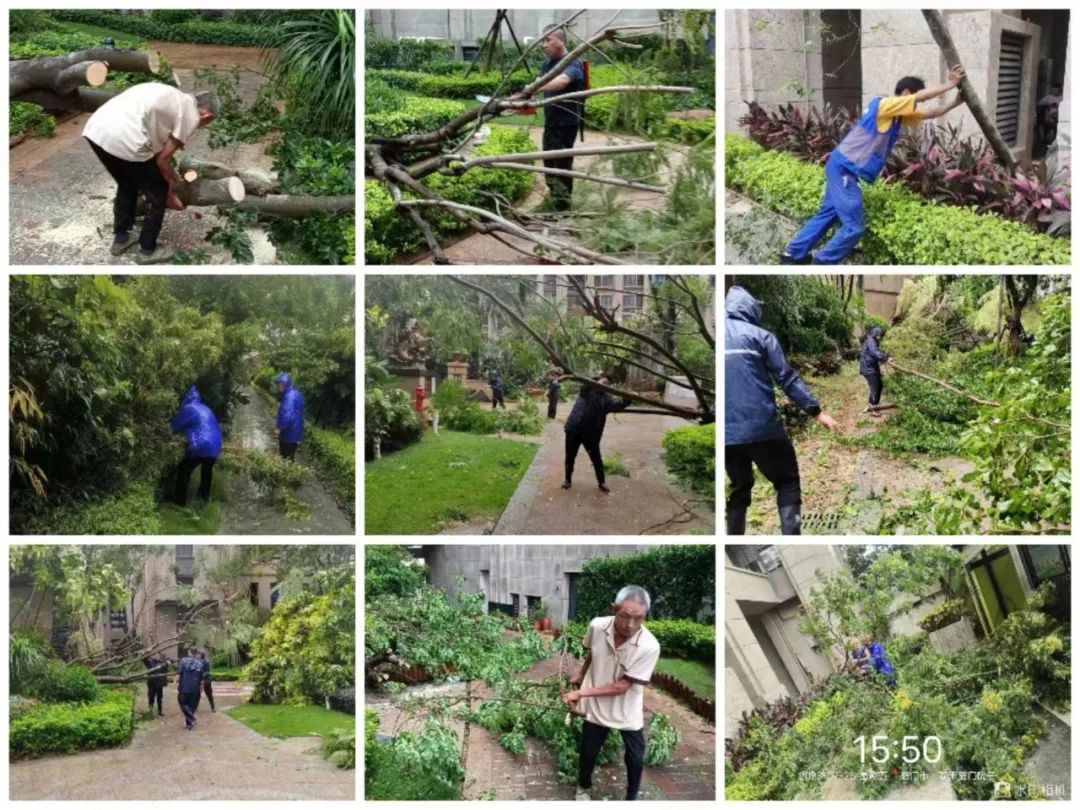 在台风来临前,和记娱乐物业厦门区域各物业服务中心提前做好相关防台防御工作,全面落实防台举措,通过微信朋友圈/业主群、小区公告栏等处发布防台温馨提示,开启防台防汛紧急预案,全面排查防洪防涝应急物资、清理天面及地面排水管道、排查设施设备运行情况、巡查空置房屋等。
